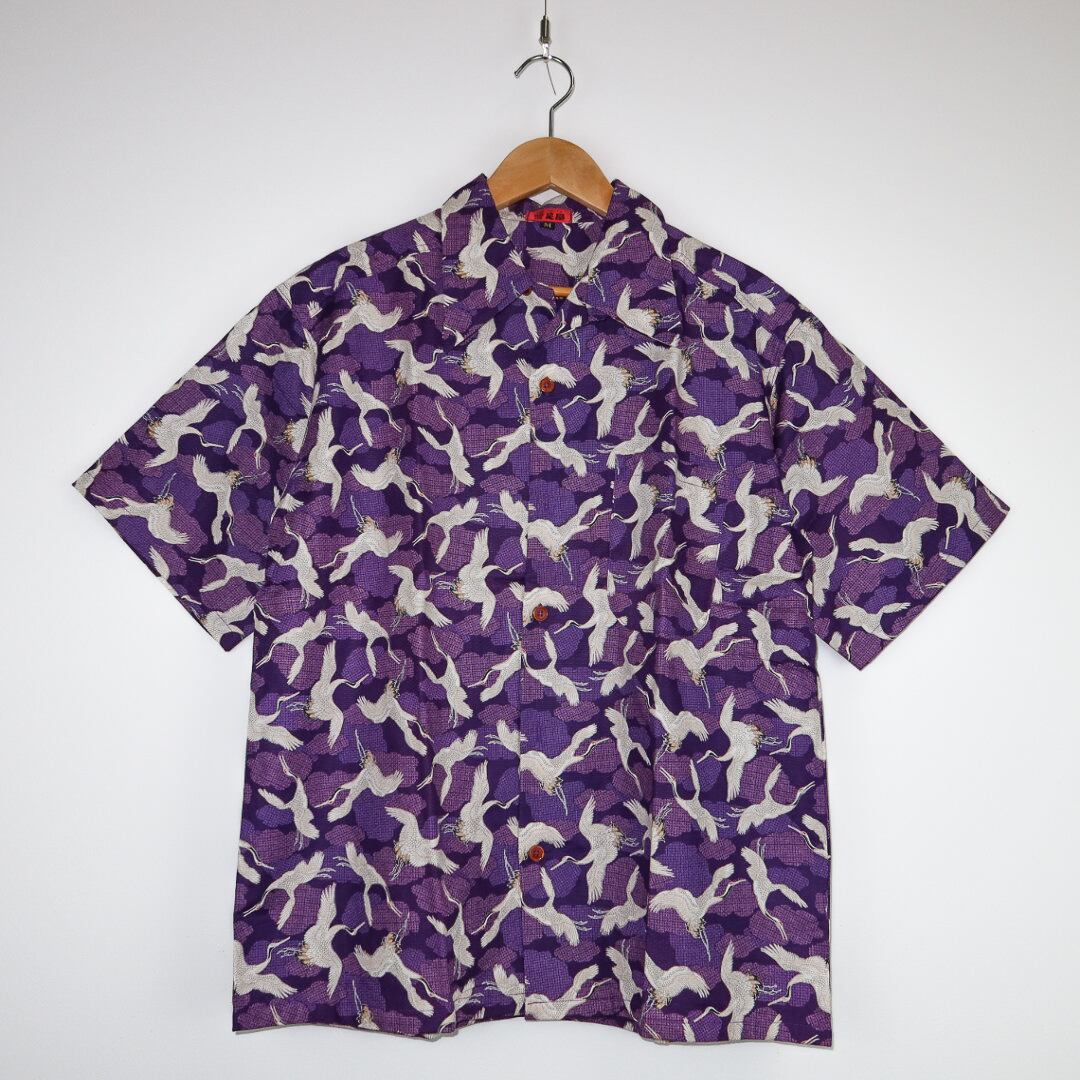 綿100%の刺子織の生地に大空を羽ばたく白い鶴と絞り柄の雲が描かれています。たいへん縁起のよい古典柄のアロハシャツです。