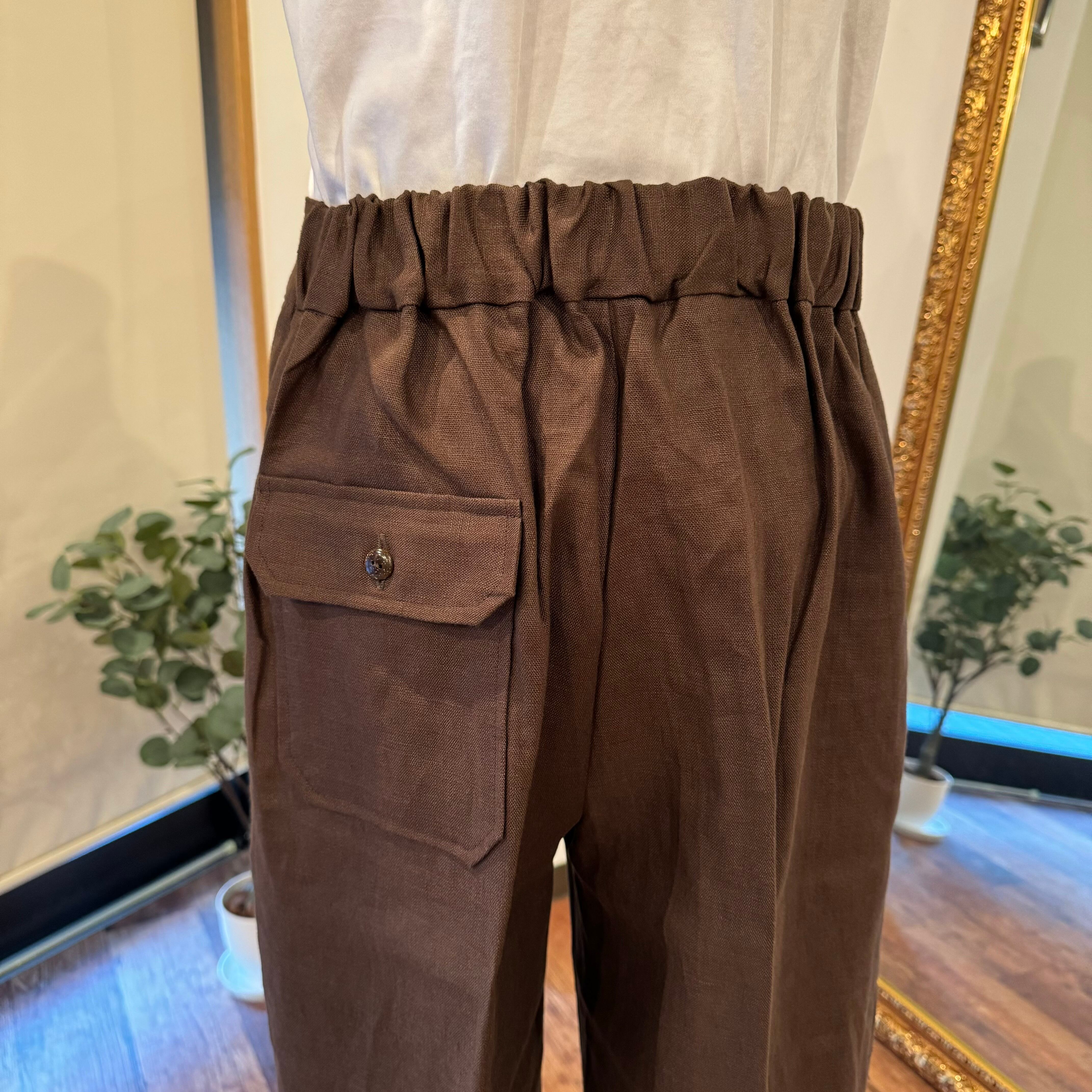 ●ズボン/ウエスト後ゴム(紐付)、前ファスナー付、裾紐付、左右ポケット、左後かぶせ付き